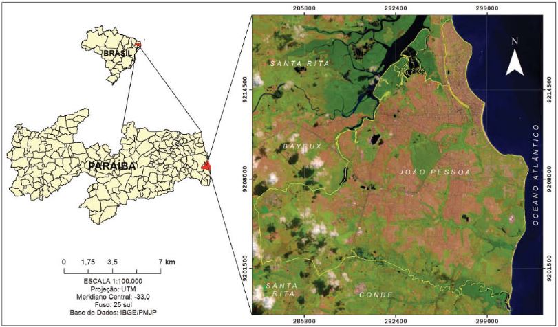 Em relação à hidrografia, o município de João Pessoa abrange o domínio das bacias hidrográficas dos rios: Jaguaribe, Marés Sanhauá, Gramame, Cuiá, Jacarapé, Aratu e Cabelo. Dentre estas, a maioria se encontra sobre os domínios urbanos, a exemplo da bacia do rio Jaguaribe, onde se verifica a ocorrência de diversas áreas vulneráveis à ocorrência de inundações, erosões e movimentos de massa (Oliveira, 2001; PMJP, 2015, Santos et al., 2015).
