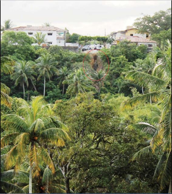 As feições erosivas ocorrem como consequência de um sistema inadequado de drenagem e pela falta de pavimentação. A impermeabilização do solo no topo dos tabuleiros costeiros contribui com o aumento da energia do escoamento superficial devido à drástica redução da infiltração, culminando na formação de ravinas e voçorocas, na porção da inflexão topo/encosta.
