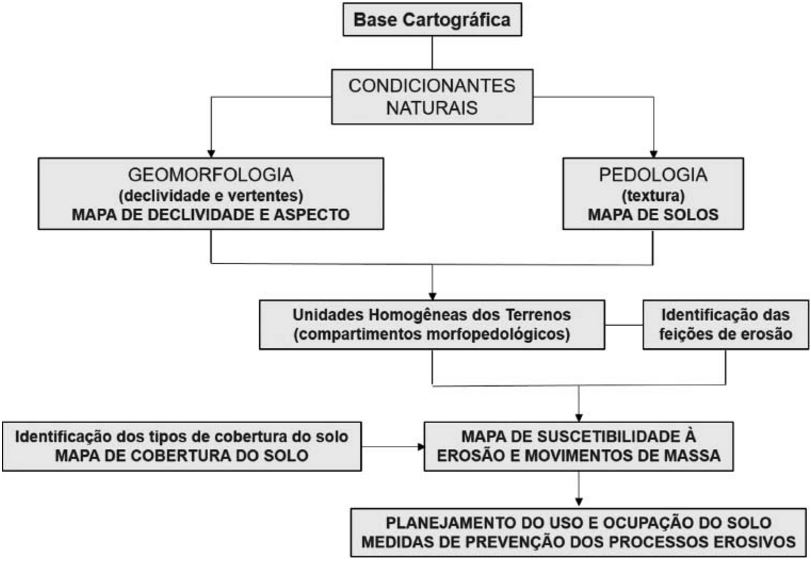 O presente trabalho foi desenvolvido com base na análise integrada da paisagem por sobreposição de integrantes morfopedológicos e antrópicos, objetivando a delimitação de compartimentos homogêneos suscetíveis à ocorrência de erosão e movimentos de massa (figura 2).