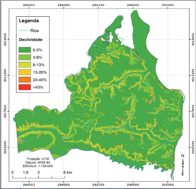 Na área de estudo, algumas regiões merecem destaque, pois a ocorrência de vertentes com elevado grau de declividade oferecem riscos às populações residentes nesses locais. A partir do mapa de declividade foi possível constatar a predominância das categorias: plano (0-3%) e suave plano (3-8%), perfazendo cerca de 181,45 km2, correspondendo a 91,1% da área total. Isto se deve ao fato de que o relevo predominante na área é constituído por tabuleiros litorâneos.
