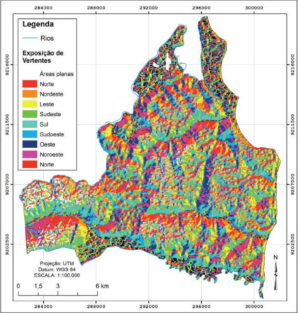 O mapa de exposição de vertentes revelou importantes informações acerca da orientação das encostas na área de estudo e como este quadro pode influenciar nos processos de erosão e movimentos de massa. Certamente, aquelas encostas que se encontram voltadas para sudeste, leste e até mesmo nordeste terão maior suscetibilidade à ocorrência desses processos, devido à ação dos ventos litorâneos, em períodos de maior intensidade pluviométrica (figura 4).