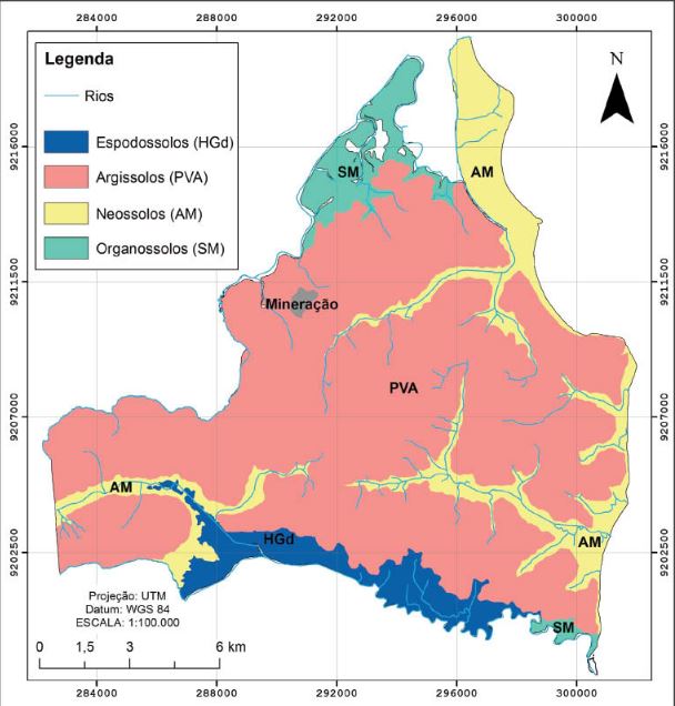 A partir da base fornecida pela EMBRAPA, Solos UEP Recife (2006), na escala de 1:400.000, com auxílio das curvas de nível e da imagem OLI/Landsat, tornou-se possível obter informações acerca da distribuição dos solos na área de estudo, onde foram detectados os seguintes tipos: Argissolos, Espodossolos, Organossolos e Neossolos (figura 5).