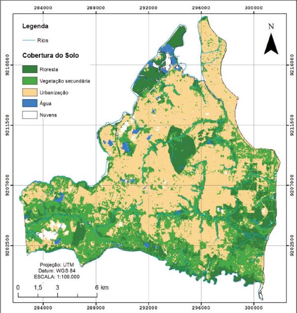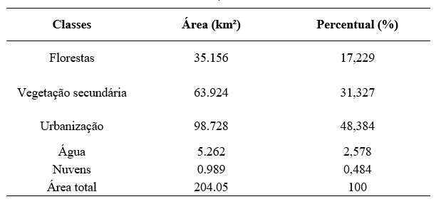 O mapa de cobertura do solo revelou uma extensa área urbanizada, com 98,7 km2, correspondendo a 48,3% da área total. As áreas florestais abrangem 35,1 km2, perfazendo cerca de 17% do total de cobertura do solo. Essas áreas compreendem as unidades de conservação, a exemplo da Mata do buraquinho, localizada na porção central do município. O restante do percentual, 34,3%, corresponde às áreas de vegetação secundária, corpos d’água e nuvens, que também inclui áreas não classificadas devido às sombras (tabela 5).