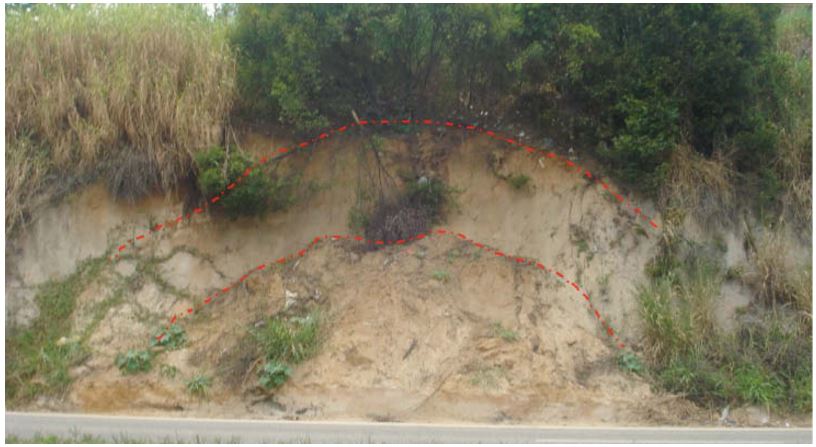 Nesta localidade, foram observados processos de escorregamentos do talude em virtude da forte inclinação do terreno que excede o limite de resistência ao cisalhamento nas condições de presença de água, dando origem a cicatrizes de rupturas circulares (figura 9).