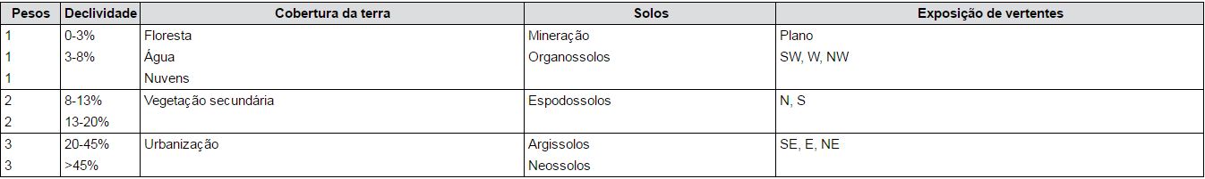 Além disso, foram atribuídos pesos individuais a cada uma das classes dos respectivos mapas, levando em consideração a influência de cada uma das mesmas para a ocorrência dos processos analisados (tabela 2).