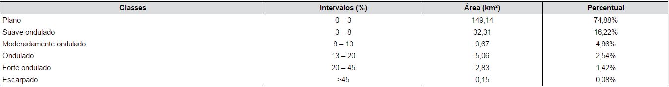 As classes de declividade adotadas obedeceram sistematicamente à proposta metodológica descrita em Pereira e Lombardi-Neto (2004), contendo a seguinte legenda: plano (0-3%), suave ondulado (3-8%), moderadamente ondulado (8-13%), ondulado (13-20%), forte ondulado (20-45%) e montanhoso ou escarpado (>45).