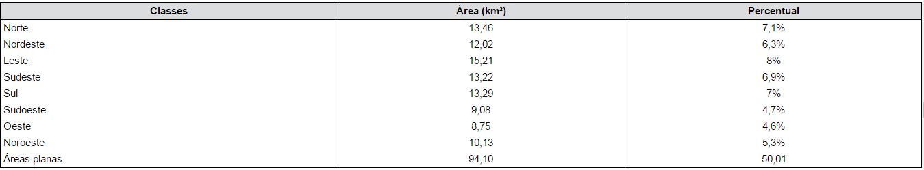 Foi detectado que 6,9% das encostas estão voltadas para sudeste, que consiste na porção mais suscetível à ocorrência de eventos chuvosos extremos. As vertentes leste e nordeste, que possuem um grau semelhante de risco, abrangem 14,3% da área estudada. O restante das classes, por sua vez, abrangem 28,7%, enquanto as áreas planas abrangem metade da área do município de João Pessoa, com exatos 50% (tabela 4).