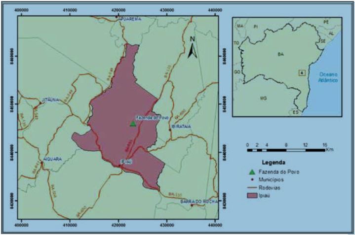 Duas bacias hidrográficas têm seus principais rios passando pelo município: o rio de Contas e o rio Água Branca. A sua geologia predominante se caracteriza por gnaisses e metatexitos (Superintendência de Geologia e Recursos Minerais - SGM, 1994); a vegetação característica é a de Floresta Ombrófila Densa (RADAMBRASIL, 1981-1983); o Bioma onde está inserido é o da Mata Atlântica; e o clima predominante da região onde se encontra é Úmido e Subúmido a Seco (Superintendência de Estudos Econômicos e Sociais da Bahia. Atributos Climáticos do Estado da Bahia, 1998) - e, conforme classificação de Köppen, define-se como clima do tipo tropical úmido “Am”. A Comunidade Rural Fazenda do Povo (CRFP) está localizada no município de Ipiaú, na Mesorregião Sul Baiano, Microrregião Ilhéus-Itabuna, Estado da Bahia, Nordeste do Brasil, nas coordenadas geográficas de latitude 14º3’21.19’’S e longitude 39º42’39.15’’W, possui uma área da unidade territorial de 157 hectares e 25 ares com cerca de 140 famílias residentes, e dista 11 km da sede municipal (Figura 2).