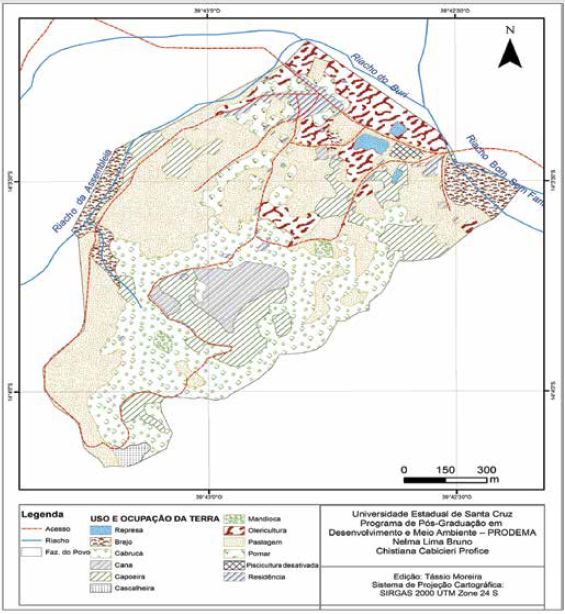 No mosaico da paisagem atual da comunidade identificam-se os seguintes tipos de uso e ocupação da terra: represa, brejo, áreas de cacau desenvolvidas sob o sistema cabruca, plantios de cana, áreas de capoeira, cascalheira, plantios de mandioca, plantios de olericultura, áreas de pastagem, áreas de pomar, piscicultura desativada e área residencial (Figura 3). Há um maior predomínio de áreas de pastagens, seguido de áreas utilizadas com o plantio de cacau sob o sistema cabruca. Percebe-se pela grande presença de áreas de pastagens e de capoeira que a vegetação nativa foi largamente retirada ao longo da existência da comunidade.