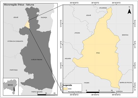 O município de Ipiaú encontra-se localizado na Mesorregião Sul Baiano, Microrregião Ilhéus-Itabuna (Figura 1), conforme regionalização para o Estado da Bahia proposta pelo Instituto Brasileiro de Geografia e Estatística - IBGE (divisão regional com base no predomínio de uma cidade – aglomeração urbana – sobre o espaço regional), nas coordenadas geográficas de latitude de 14º08’13”S e de longitude de 39º44’02”O. Este município dista em torno de 185 km da capital do estado (PNUD, 2000), possui uma área da unidade territorial de 267,33km² (IBGE, 2010), com população de 44.390 habitantes e densidade demográfica de 166 hab./km² (IBGE. CENSO DE 2010). No que se refere às suas fronteiras territoriais, limita-se com os seguintes municípios: ao Norte, com o município de Jequié; ao Nordeste e ao Leste, com o município de Ibirataia; ao Sudeste, com o município de Barra do Rocha; ao Sul, com o município de Itagibá; ao Sudoeste, com o município de Aiquara; e, ao Oeste, com o município de Jitaúna.