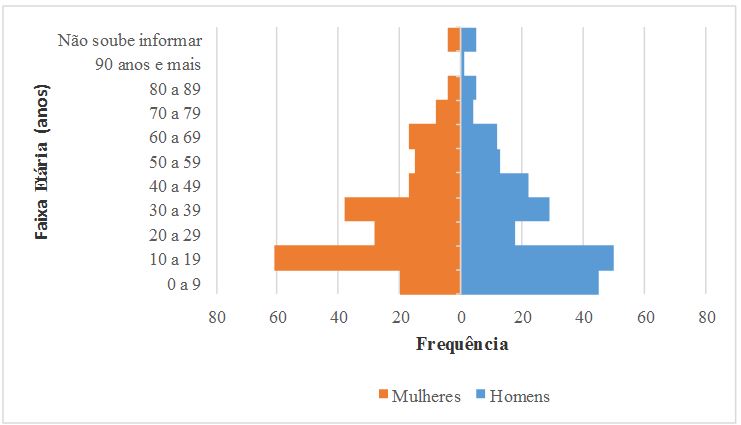 Das 416 pessoas identificadas, sobressai o sexo feminino com 212; as pessoas do sexo masculino perfazem um total de 204. Do total dos moradores, 42,3% são crianças e adolescentes de 0 até 19 anos de idade, ou seja, 176 pessoas – sendo que 15,6% estão na faixa etária de 0 a 9 anos de idade (terceira maior faixa), e 26,7% estão na faixa etária de 10 a 19 anos de idade (primeira maior faixa). A segunda maior faixa de idade é a de 30 a 39 anos, que corresponde a população de adultos, perfazendo um total de 67 pessoas (16,1% dos moradores). Portanto, a pirâmide etária da comunidade apresenta um maior alargamento na base (Figura 4). Esse fato aponta significativa expectativa de vida ao nascer, boa taxa de fecundidade, e a presença significativa de crianças e adolescentes entre a população do lugar, o que indica grande expectativa de futura renovação da população jovem e adulta da comunidade, e boa taxa atual de permanência no lugar por parte da camada jovem/adulta. Não podemos deixar de assinalar a grande diferença entre gêneros na faixa de 0 a 9, os meninos são bem mais frequentes que as meninas sem que haja uma explicação evidente. Esta parece uma forma involuntária da comunidade em contribuir para a masculinização do campo. Já o envelhecimento da comunidade participante não pode ser observado como veremos a seguir.
