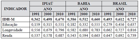 Ao se analisar o indicador Índice de Desenvolvimento Humano Municipal (educação, longevidade e renda) de Ipiaú, observa-se, por meio da tabela 5, que no ano de 1991, seguindo tendência do Estado da Bahia e do Brasil, o município apresentava um IDH-M muito baixo, sendo que a variável que mais contribuiu para isso foi a educação. No ano 2000, o IDH-M do município ainda era baixo, enquanto a Bahia e o Brasil já haviam evoluído para Médio Desenvolvimento Humano. Somente no ano de 2010 é que o município passou a apresentar uma evolução para o IDH-M, igualando-se à Bahia e ao Brasil, com Médio Desenvolvimento Humano – com um índice superior ao do Estado da Bahia, e ocupando a 2663ª posição no ranking nacional. A educação continuou sendo a variável mais fraca para Ipiaú.