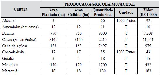 Na agropecuária municipal os produtos agrícolas que se destacam em produção e valores da produção são: abacaxi, amendoim em casca, banana, cacau (em amêndoa), cana-de-açúcar, coco-da-baía, goiaba, mandioca e maracujá. O coco-da-baía representou em 2013 a maior produção em quantidade em fruto; e a banana, em toneladas; e em valor, o cacau (Tabela 8).