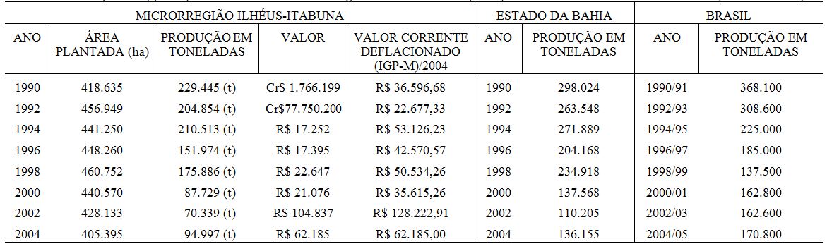 Entre os anos de 1990 a 1998 houve oscilação na tendência da utilização dos hectares de terras plantados com cacau na microrregião, ora com aumento nas áreas plantadas, ora com redução. Já de 1998 a 2004, houve uma tendência contínua de redução nas áreas plantadas com cacau, sendo que, em alguns municípios, muitas áreas plantadas com cacau foram substituídas por áreas de pastagem, ou destinadas a outras atividades. Tendência parecida ocorreu na evolução da produção de cacau em toneladas, embora com variações mais frequentes. Nos primeiros anos da década de 2000 a produção de cacau na microrregião foi menor do que a da década de 1990. Essa tendência de oscilações na produção de cacau na microrregião foi seguida pela Bahia e pelo Brasil (Tabela 1), o que causou déficit do produto, levando o país a ter que importa-lo para abastecer as indústrias, as quais, devido a forte demanda do produto, passaram a pagar um ágio (prêmio) em US$/t no mercado nacional em cima do preço cotado na bolsa de Nova York (Zugaib; Andrade, 2015).