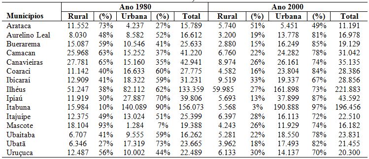 Com essa última crise na cacauicultura alguns municípios da microrregião lentamente passaram por um processo de reorganização socioeconômica, sobretudo entre fins da década de 1990 e primeira década de 2000, e a ter a maior parcela de suas populações concentradas nos espaços urbanos. Embora outros municípios de maior expressão já se encontrassem em processo de reorganização socioeconômica antes dessa crise, a exemplo dos municípios de Itabuna e Ilhéus (Polo Regional), e já tinham passado bem antes pelo processo de inversão da concentração da maior parcela da população do espaço rural para o espaço urbano (seguindo uma tendência nacional), - a exemplo de Ilhéus, Itabuna, Ipiaú, etc. Na tabela 2, tem-se apresentada a população de 15 dos 41 municípios da atual Microrregião Ilhéus-Itabuna, nos anos de 1980 e 2000. Segundo Rocha (2008), esses quinze municípios foram os mais atingidos na microrregião pelos efeitos da vassoura-de-bruxa.