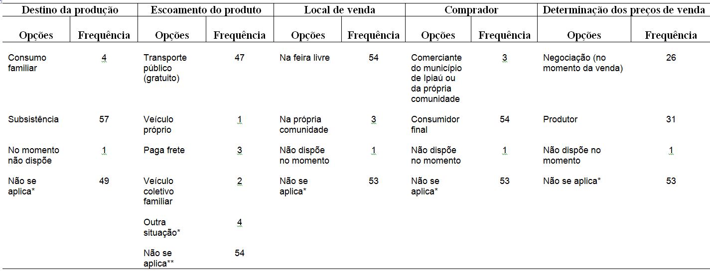 O destino dado para a maior parcela do principal produto desenvolvido na comunidade (hortaliças) é a comercialização, sobretudo na feira livre da cidade de Ipiaú. Um número de 57 famílias, das que produzem hortaliças, sinalizaram desenvolver para a subsistência (que envolve ao mesmo tempo a comercialização e o autoconsumo); 54 famílias apontaram comercializar hortaliças na feira livre de Ipiaú (e dentre essas, algumas na de Itacaré e de Ibirataia), enquanto apenas três famílias sinalizaram vender a sua produção dentro da própria comunidade, e uma família não dispunha do produto no momento da pesquisa (Tabela 9).