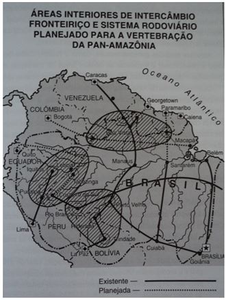 Ao entender a constituição do território brasileiro como sendo fruto de quatro fases, a saber: fase de expansão; fase de regularização; fase de demarcação e fase de vivificação ou povoamento, Meira Mattos propunha como projeto geopolítico vital para o Brasil nas décadas de 1960-70 o desenvolvimento e a ocupação da fronteira ocidental do País, em particular das terras amazônicas. As premissas básicas eram: Segurança & Desenvolvimento (Meira Mattos, 1990, p. 65). Ademais, a efetivação do plano de continentalização da América do Sul abrangeria, assim afirma Meira Mattos (1990, p. 110), “enormes regiões interiores de nove países fraternos e vizinhos, mas que nunca souberam dar-se as mãos pelas portas das conexões terrestres de seus territórios, que mal conheciam, escravos que eram da via marítima para se comunicarem.”[11]