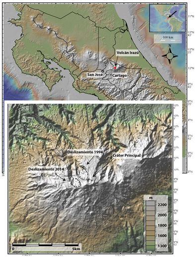 Al NorOeste del cráter principal, se encuentra un sector geológicamente inestable conocido como “las fumarolas” (Ulloa et al., 2013), la cual es una zona de intensa alteración hidrotermal, donde en diciembre de 1994 (Figura 1) se dio una supuesta explosión freática y un deslizamiento (Fernández et al., 1994; Barquero et al., 1995). El 17 de diciembre del 2014 se registró un deslizamiento al lado Oeste de la cima del volcán Irazú (Figura 1), el cual continúa activo (Pacheco et al., 2015).