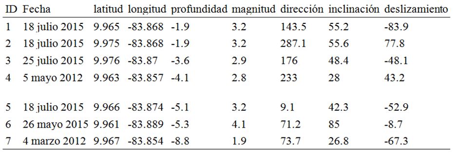Con fin de comparar cualitativa y cuantitativamente el campo de deformación inferido de las observaciones sísmicas, nosotros analizamos un total de 7 mecanismos focales elaborados a partir de la polaridad de los primeros arribos con un mínimo de 20 asociaciones, en el programa SEISAN. De este modo, se obtiene un conjunto final de mecanismos focales entre 2012 y 2015 con magnitudes locales (ML) que abarcan desde 1,9 hasta 4,1 (Tabla 1).