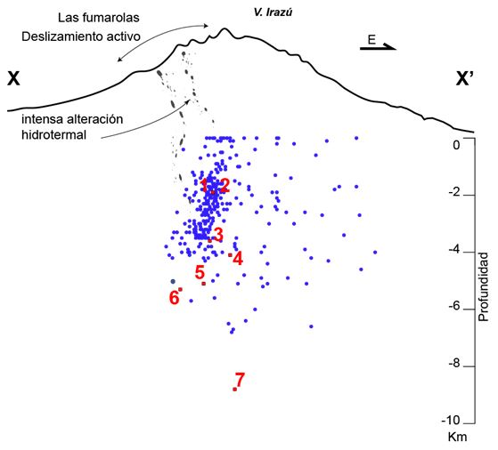 (4) La fuente sismogénica bajo el Volcán Irazú está asociada a la presencia de un cuerpo magmático cercano a la superficie que produce una somerización del límite frágil-dúctil generando una corteza adelgazada y quebradiza que favorece el fallamiento normal.