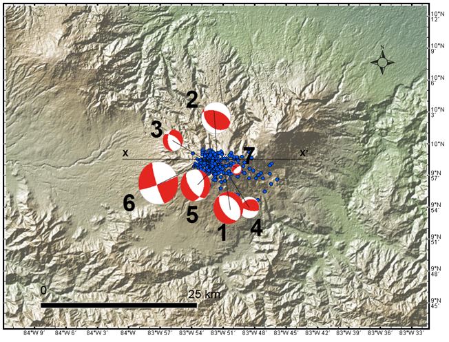 Palabras clave: volcán Irazú, sismicidad, mecanismos focales, fallas normales.