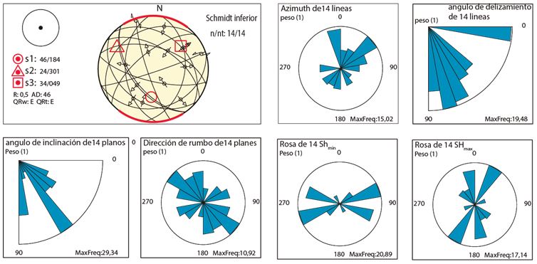 Fuente: Elaborado por los autores.Los resultados de la inversión de estrés revelan que las orientaciones de los ejes principales son sub-vertical para σ1 y cerca de la horizontal para σ2 y σ3. La solución obtenida muestra un sistema de extensión radial en dirección NorEste-SurOeste. El eje σ2 corresponde al esfuerzo SHmax en dirección 28º/304º con un valor de R’ = 0,5 (Figura 4).