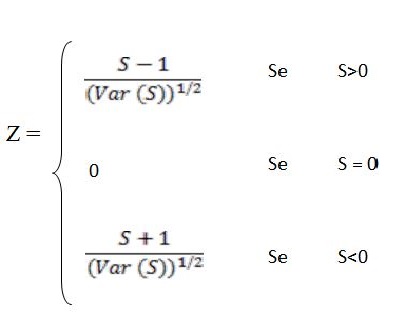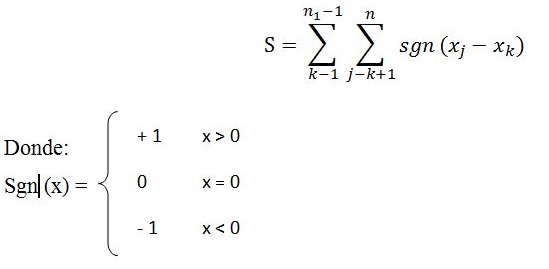 Xj representa los datos estimados de la secuencia de valores, n representa el tamaño de la serie temporal. Reciben valor cero (0) si (Xj - Xk) = 0; y [-1] si (Xj - Xk) > 0, por fin, [1] si (Xj - Xk) < 0. Supone que H0 sea verdadera, S debe presentar una distribución aproximadamente normal con media cero y variancia Var(S) = [(n*(n-1)*(2*n+5)]/18.