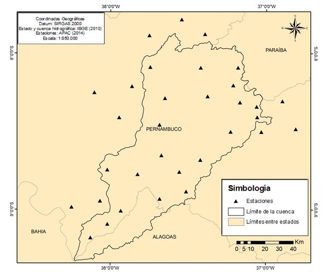 Este trabajo utilizó como método de análisis de la tendencia de la precipitación el test Mann-Kendall. El test fue aplicado en los datos anuales de precipitación del período de 1930 hasta 2014. Fueron utilizados únicamente datos de las estaciones meteorológicas ubicadas en el estado de Pernambuco. No hay muchas estaciones activas en el extremo sudoeste de la cuenca, territorio que corresponde al estado de Alagoas, y las escasas estaciones que existen presenta fallas en los datos.