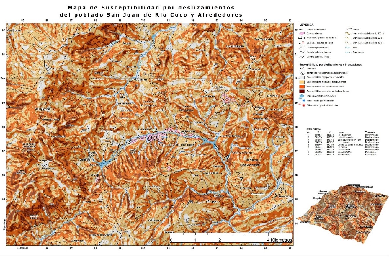 El mapa de susceptibilidad a deslizamientos de Nicaragua, escala 1:750.000 (Ineter-BGR, año 2003) muestra que la mayoría de sitios de inestabilidad de laderas se concentran en el relieve de montaña de las regiones del centro, norte y la cadena volcánica del Pacifico. El área de estudio se ubica la cordillera de Dipilto de relieve montañoso, caracterizada por zonas de altas pendientes. La ocurrencia de procesos de inestabilidad de laderas en San Juan del Río Coco se debe, fundamentalmente, a factores condicionantes como litología, pendiente, topografía, estructura y forma del terreno y erosión hídrica.