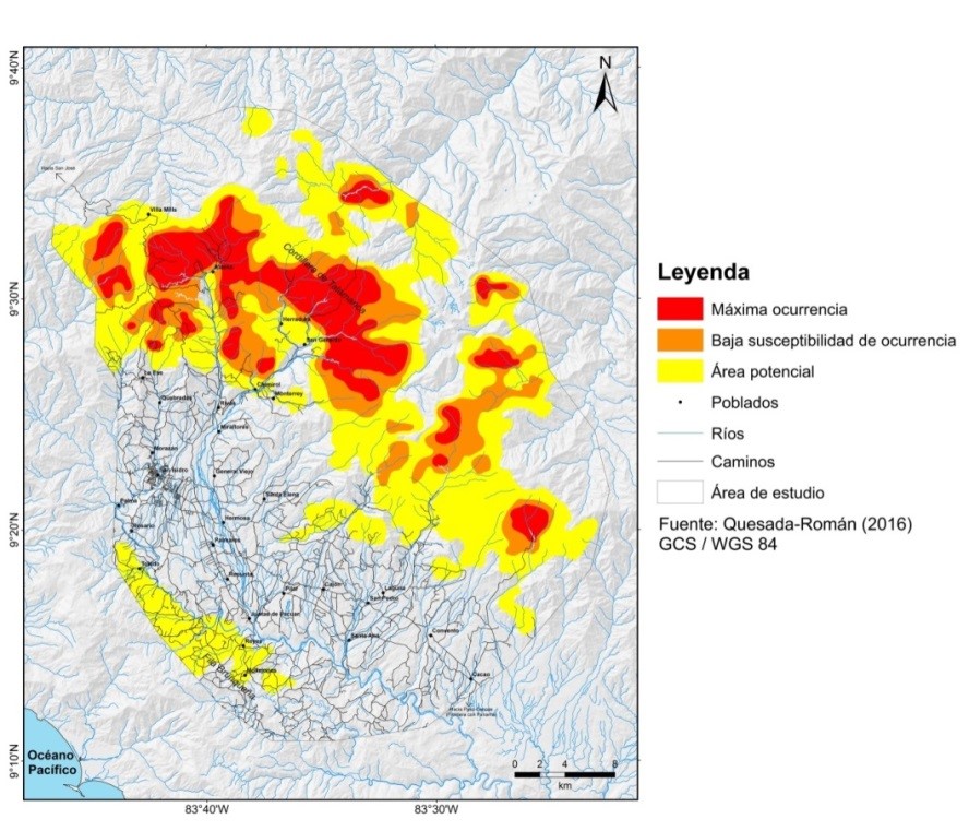 De acuerdo a Quesada-Román (2016), se describen las condiciones que favorecen la existencia de terrenos susceptibles a presentar diferentes grados de afectación real por procesos de remoción en masa. Se establecieron tres categorías cuya representación espacial se identifica con el color rojo las zonas de máxima ocurrencia, con el color naranja de baja ocurrencia y el color amarillo representa áreas potenciales (Figura 1).
