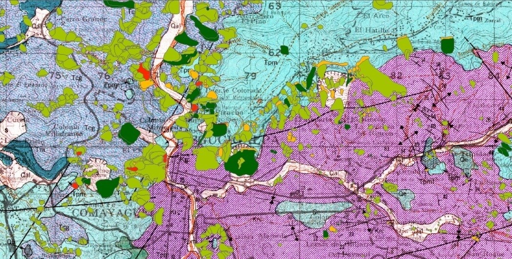 Otro factor relevante que puede explicar esta mayor densidad de deslizamientos en el lado norte es la presencia de contactos litológicos como en la frontera entre las rocas volcánicas del Grupo Padre Miguel y las rocas sedimentarias subyacentes del Grupo Valle de Ángeles, en zonas de deslizamientos relevantes, tales como El Berrinche, El Reparto, Col. Viera, Col. Canaán, entre otras. Otro ejemplo de los efectos de estos contactos, se presenta en el Cerro El Pedregal, donde se han identificado y desarrollado numerosos movimientos de ladera en los límites entre un domo de basalto del Cuaternario e ignimbritas y coladas ríolitícas del Grupo Padre Miguel y de la Formación Matagalpa (Hirota&Kamiya, 2014). En la Figura 3, se muestran ejemplos de estos contactos o fronteras.