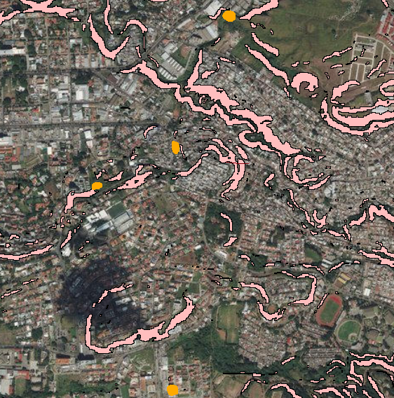 La imagen muestra de Topografías de deslizamiento (dorado) que no coinciden con zonas de amenaza alta a movimientos de ladera (rosado)