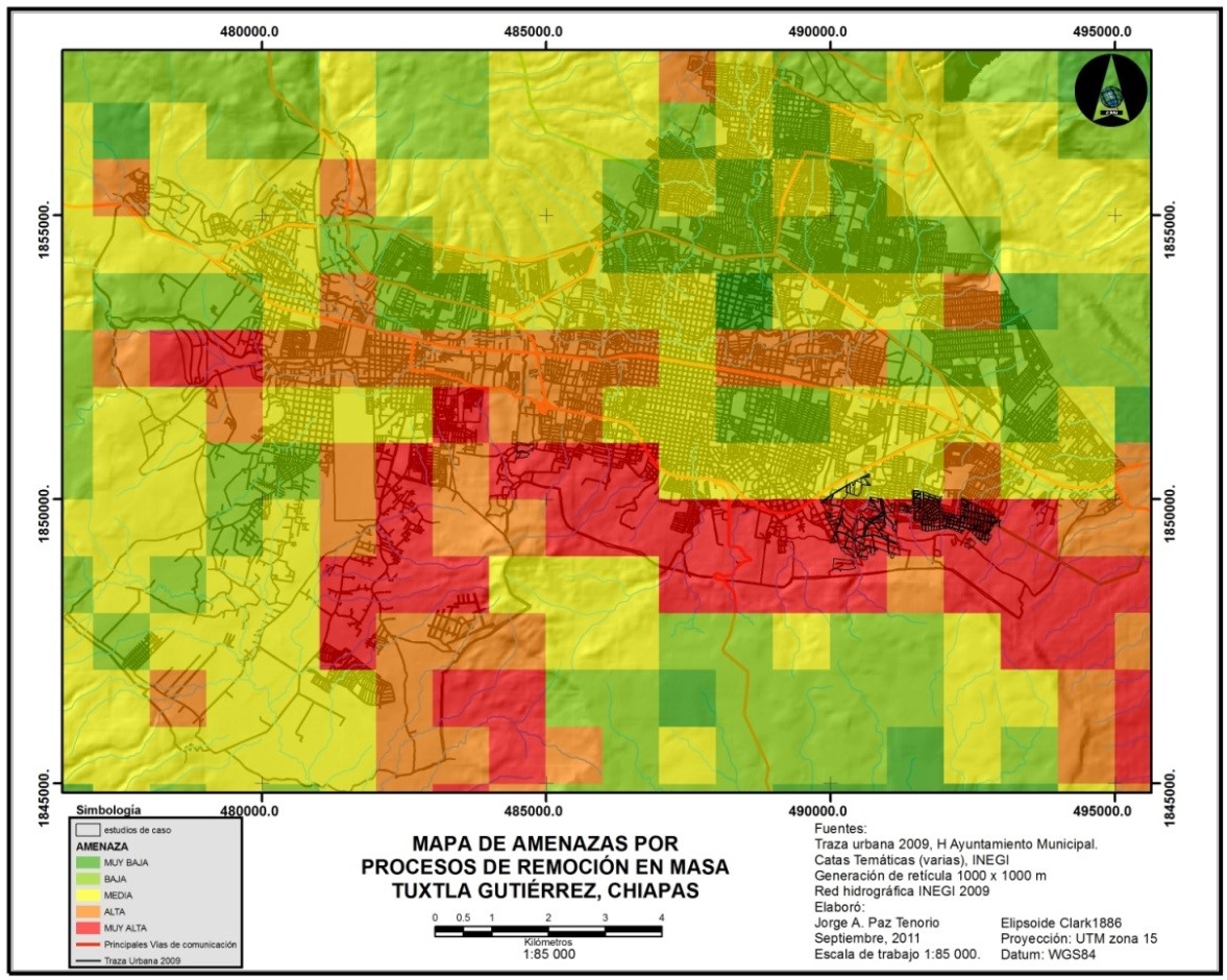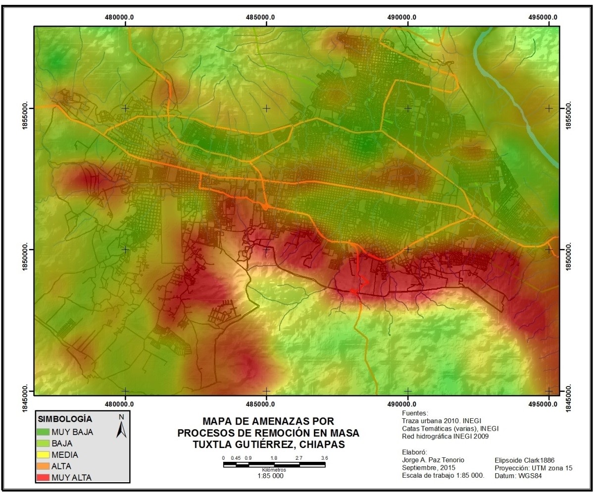 La aplicación de la heurística como método de aproximación resultó adecuada al contar con un vasto conocimiento documental y de campo de la zona, y compensar las limitantes de escala de la información cartográfica disponible. Esto representa un sólido sustento para la elaboración del mapa de Amenazas por Procesos de Remoción en Masa para Tuxtla Gutiérrez, Chiapas escala 1:85.000 (Paz-Tenorio et al., 2012). Por lo anterior, el método heurístico con base en mapas cualitativos propuesto, fue sin duda el adecuado. En 2015, se revisa el mapa y se decide mejorarlo, aplicando además el análisis multicrietrio, combinación también empleada por Muñiz-Jáuregui y Hernández-Madrigal (2012) en su mapa de susceptibilidad a Remoción en Masa en Puerto Vallarta, Jalisco, México.