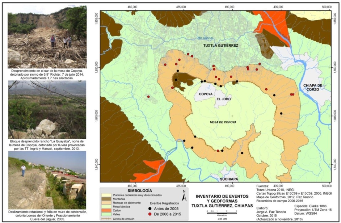 Previamente al Mapa de Amenazas por Procesos de Remoción en Masa de Tuxtla Gutiérrez (Paz-Tenorio et al. 2011) (Figura 5), se obtuvo el mapa de Geoformas (2012, mejorado en 2015) (Figura 6), que caracteriza el relieve de acuerdo a la taxonomía propuesta por Priego et al. (2008), en donde se refieren a los depósitos de talud como “rampas de piedemonte”. A este mapa se le adicionó la información disponible en el inventario de eventos, que suma 31 eventos.
