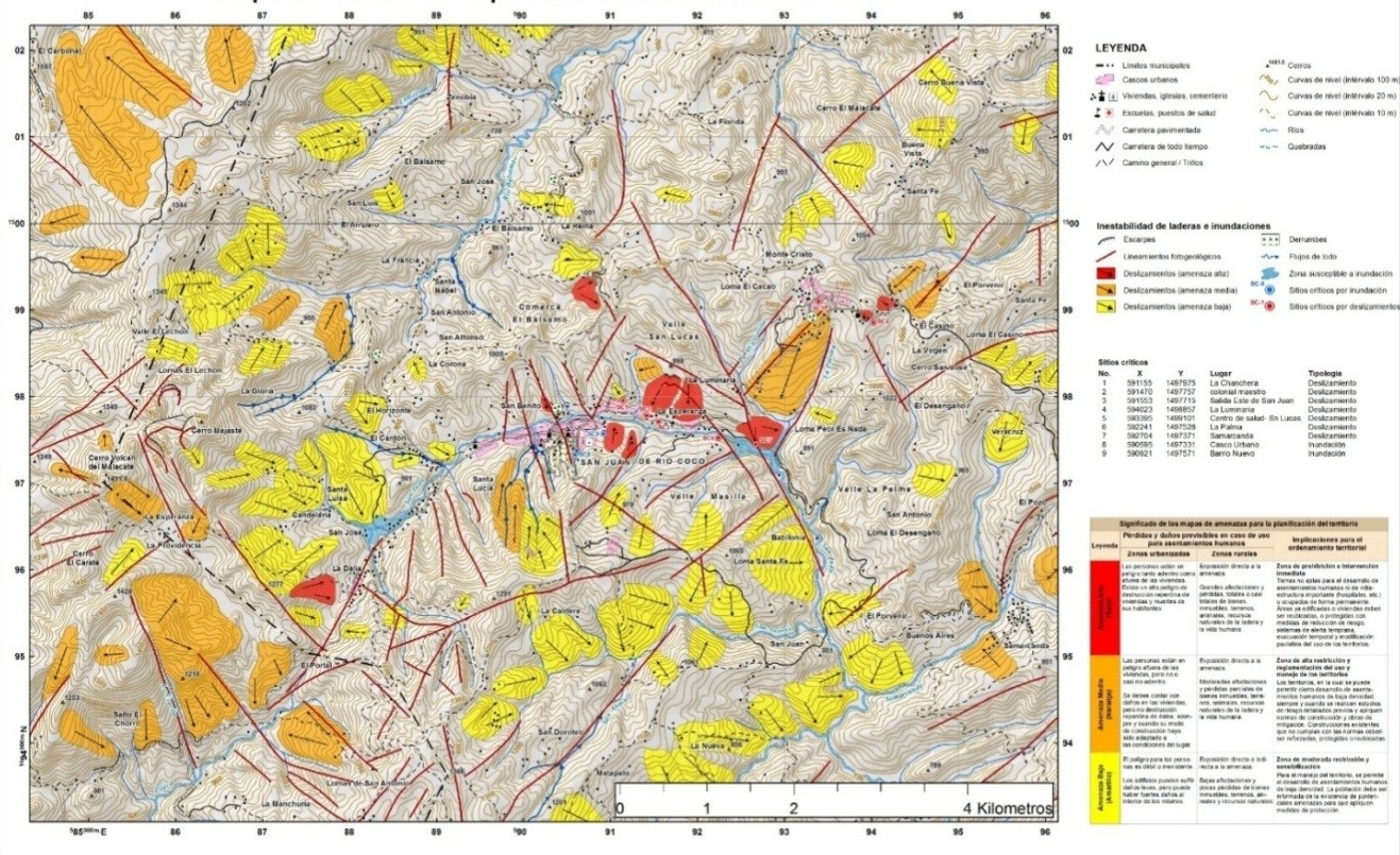 Es muy importante señalar que la escala a la que se han realizado estos estudios, debe de ampliarse con la finalidad de definir mejores zonas potenciales y su posible reactivación, así como monitoreo continuo de estos procesos, con la finalidad de tener información detallada para tomar medidas de prevención y planificación del uso del terreno en el municipio. Existe una base de datos creada en 1999 a través de un Sistema de Información Geográfica (SIG). La información de la base de datos se recopilo, mediante proyectos de mapeo realizados en el tema de susceptibilidad de laderas y el reconocimiento geológico en sitios donde han ocurrido deslizamientos, principalmente en el norte, centro y a lo largo de la cadena de volcanes activos del país. Un total de 2.003 sitios de deslizamientos se habían registrados al año 2005.