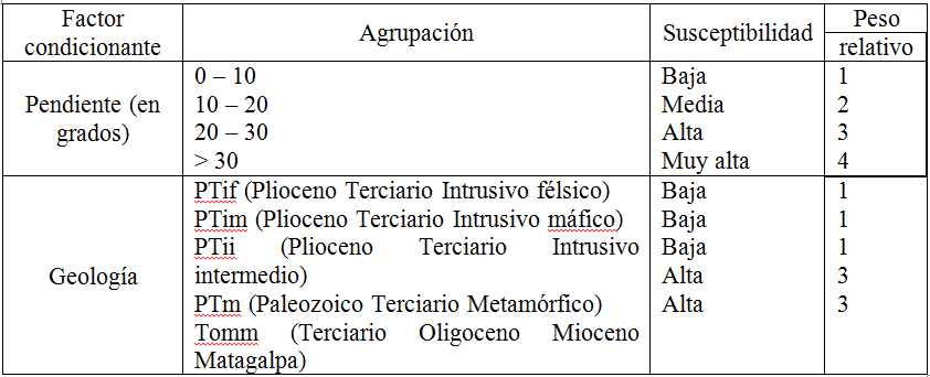 En el análisis enfocado al proyecto de San Juan del Río Coco se utilizó el Método de Superposición de Mapas con Índices Multiclases, incluido en las herramientas del Análisis Espacial de ArcGIS (Versión 10.2). A partir de la combinación de factores condicionantes, tales como pendiente y geología, se logró identificar las laderas más propensas a la ocurrencia de deslizamientos. La información de pendientes se derivó de las curvas de nivel del terreno con intervalo vertical de 20 metros, obtenidas de los mapas topográficos de INETER, año 1988, escala 1:50.000; y la geología procede de los mapas geológicos elaborados por Catastro e Inventario de los Recursos Naturales, año 1972, escala 1:50.000. La información fue incorporada a una base de datos geográfica utilizando el programa ArcGIS (Versión 10.2). Para cada factor condicionante se generó un mapa preliminar, agrupando la información por categorías y asignando pesos relativos de susceptibilidad a inestabilidad de laderas. Los mapas se elaboran en formato raster con un tamaño de celda de 20 metros. El mapa resultante muestra cuatro zonas o rangos de susceptibilidad (baja, media, alta y muy alta). Esto permitió caracterizar la distribución espacial de los factores condicionantes, así como mostrar las áreas relativamente seguras ante deslizamientos y zonas críticas propensas a deslizarse.