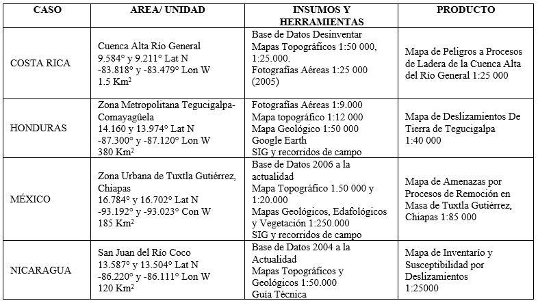 A partir de los estudios de caso por país y la disponibilidad de información para cada uno de ellos, se realizó un cuadro comparativo (Cuadro 2), en el cual se plasman los casos, áreas estudiadas, los insumos y herramientas, así como los productos obtenidos en términos de movimientos de ladera.
