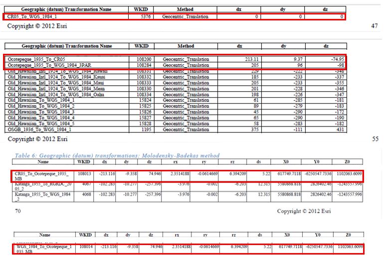 Environmental Systems Research Institute (ESRI). (2012). ArcGIS 10.1 Geographic and Vertical Transformation Tables. California, EEUU. Disponible en la documentación de instalación del programa ArcGIS, en la ruta: C:\Program Files (x86)\ArcGIS\Desktop10.3\Documentation\ geographic_transformations.pdf