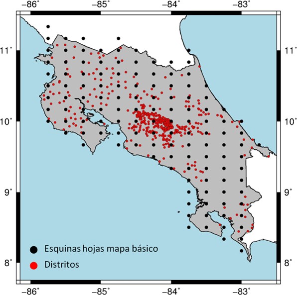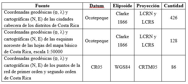 Se consideraron dos conjuntos de datos oficiales, conformados principalmente por coordenadas geodésicas: el primero, referido al antiguo datum Ocotepeque, elipsoide de Clarke 1866 y conformado por las cabeceras de los distritos de Costa Rica (Costa Rica, 2001) y las esquinas noroeste de las hojas del mapa básico escala 1:50000. El segundo grupo, referido al actual datum nacional CR05, elipsoide WGS84 consistió de los vértices de la red geodésica de primer y segundo orden de Costa Rica.