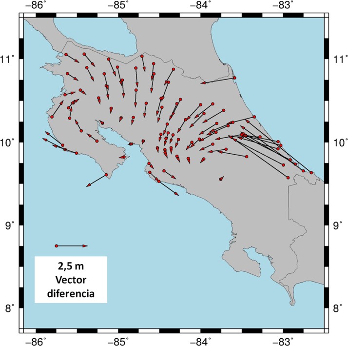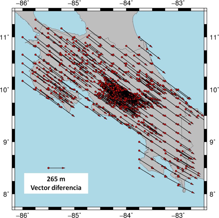 En la figura 3 se muestra la dirección del vector diferencia entre ambos conjuntos de coordenadas. Se aprecia predominantemente que las discrepancias van en la dirección sureste con un promedio de 265 m.