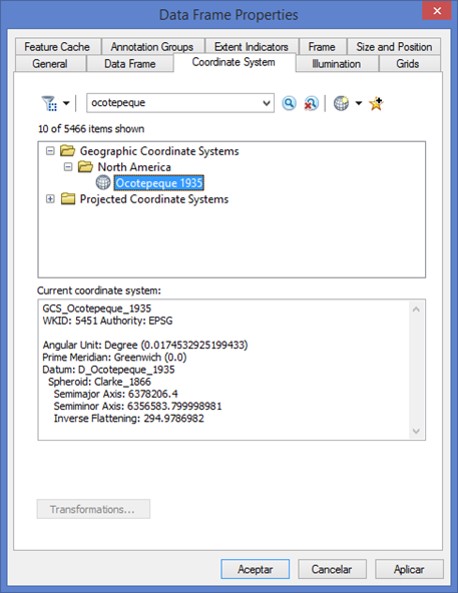 3.1.Se definió la vista de ArcMap (en el menú View: Data Frame Properties: Coordinate Systems) seleccionando a Ocotepeque 1935 como sistema de referencia, tal como se muestra en la figura 4.