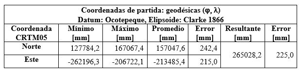Los cálculos realizados bajo el apartado C demostraron que existen diferencias, según se use la variable de transformación CR05_to_Ocotepeque_1935_MB en un sentido o en otro. Del cuadro 5 se evidencia un rango de diferencia aproximada de 4,1 m en la coordenada norte y de 5,8 m en la coordenada este usando la variable en sentido directo. La aplicación de la variable en sentido inverso refleja rangos de diferencias en las coordenadas de 5,7 m en el norte y de 6,9 m en la coordenada este. Se debe recalcar que, aunque el promedio de las diferencias sea de 70 cm ± 14 cm y de 82 cm ± 15 cm para el uso de las variables en sentido directo e inverso, el rango de diferencias dependerá de la zona de trabajo.