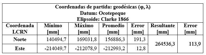 Se demuestra, como al realizar el ejercicio de considerar como elipsoide de partida WGS84 en lugar de Clarke 1866 y su respectivo datum, se encuentran diferencias como las citadas anteriormente (ver cuadro 2 y cuadro 3). Estas diferencias a nivel nacional se presentan en la figura 3, donde se tiene un desplazamiento en sentido sureste. Por otro lado, una buena lectura de la información de partida en el caso A, produce resultados nulos al calcular coordenadas cartográficas LCRN a partir de coordenadas geodésicas, datum Ocotepeque, elipsoide Clarke 1866 (ver cuadro 4).
