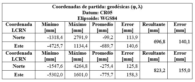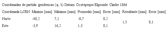 En el cuadro 4 se muestran los resultados de este proceso al compararlos con las coordenadas cartográficas oficiales. Tomando adecuadamente el datum y la superficie de origen de los datos en el proceso dentro del SIG, se aprecia como los valores promedio de las diferencias en las coordenadas norte y este, así como la resultante son prácticamente nulos, como es de esperarse.