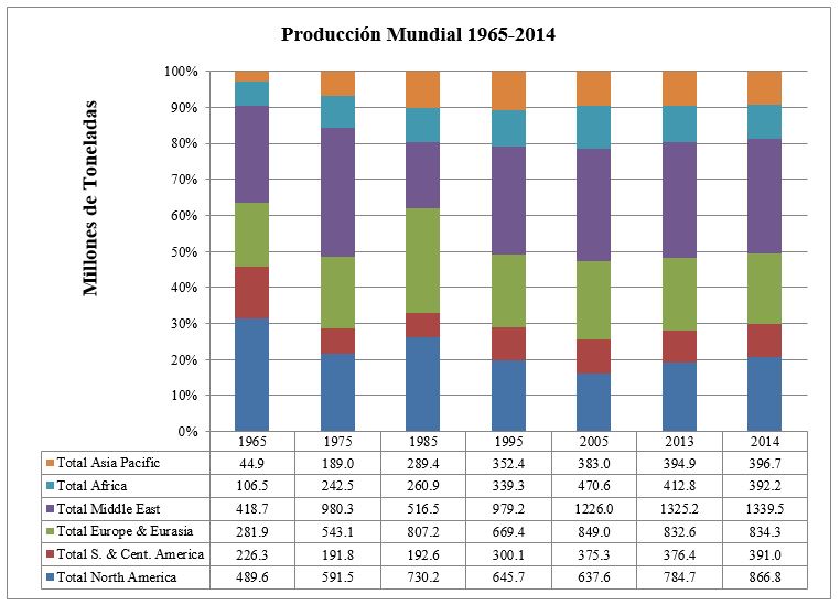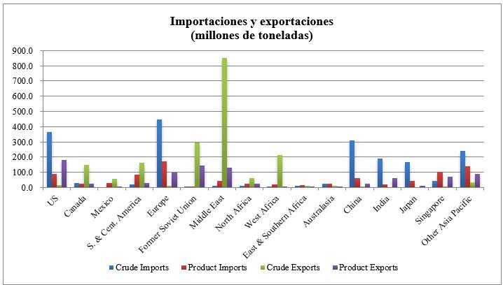 Se puede concluir entonces, que para entender la geopolítica petrolera es necesario conocer como la mercantilización de este hidrocarburo ha traído consecuencias en diversos aspectos del mundo contemporáneo, impactando el sistema global, pasando por aspectos políticos, económicos, sociales, ambientales. En la gráfica 6, pueden verse las importaciones de petróleo crudo y productos de petróleo desde diferentes países/regiones del mundo, según la clasificación regional hecha por la BP en su informe anual. La cantidad de petróleo crudo que sale de Medio Oriente es visiblemente mayor en comparación a la que sale del resto de los países en la gráfica. En contraposición a esto, Europa importa la mayor cantidad de crudo, seguido de EUA y China. Las otras regiones con importantes valores en la exportación de crudo son la antigua Unión Soviética (entre estos sabemos que Rusia y Kazajistán reportan las mayores cantidades) el Oeste de África, Centro y Suramérica (por las exportaciones venezolanas) y Canadá.