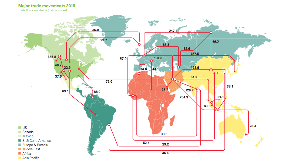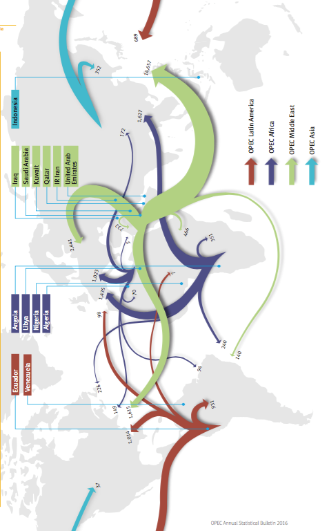 En los mapas 1 y 2 se ilustran los flujos de petróleo global. El primero de ellos indica a través del grosor de las flechas la cantidad de flujo de petróleo que sale de países de la OPEP, se constata que las líneas más gruesas salen de Medio Oriente y de África, y se dirigen a Europa occidental, Norteamérica y Asia, con mayor incidencia. El segundo mapa enseña los flujos comerciales de petróleo sin distinción entre países OPEP, en este, además de lo encontrado en el anterior mapa, puede observarse que existen flujos representativos hacia China, provenientes principalmente de Brasil y Rusia. Llaman también la atención las cantidades de petróleo que llegan a Norteamérica, lo que ratifica a la región (y de paso a los EUA) como la que presenta mayor consumo total y per cápita (Pulido Gómez, 2017)