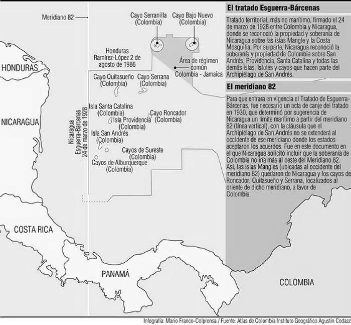 Por esta razón en 2001 el país centroamericano presentó ante la CIJ una petición para aclarar asuntos relativos a la soberanía del archipiélago, reclamando todas las islas, cayos y bancos –inclusive los definidos en el acuerdo con EUA- así como el área marítima en torno, con base en la Convención de las Naciones Unidas sobre el Derecho del Mar –CONVEMAR. El propósito era pedir el establecimiento de la frontera marítima y territorial que considerase las islas como parte de la plataforma marina nicaragüense, y una modificación en la ZEE, que no debería corresponder a la interpretación colombiana del acuerdo, según la cual los límites marítimos se extendían hasta el meridiano 82ºW (mapa 3). A su vez Colombia pretendía que la demanda no tuviese implicaciones dado que consideraba el Tratado y la Ratificación, documentos vigentes en el marco de las Relaciones Internacionales de ambos países, argumentando además, en los documentos entregados al proceso, la falta de jurisdicción de la CIJ en una controversia resuelta bilateralmente en 1928, antes de la creación del Pacto de Bogotá (1948), por lo que no era posible aplicar lo estipulado en el artículo XXXI del capítulo 43 de dicho documento. Como consecuencia la CIJ debería declarar la controversia terminada como se estipula en el artículo XXXIV4 (OEA, 1948) (International Court of Justice, 2012).