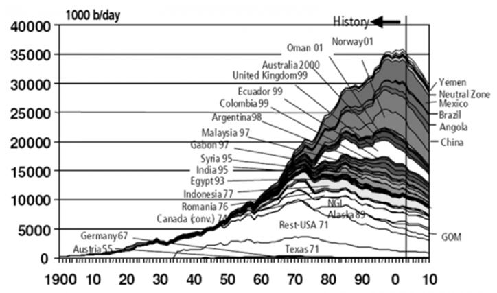 Existen evidencias de que el petróleo no es renovable en el corto plazo, el agotamiento de las fuentes de extracción es perceptible. Existen varios estudios provenientes tanto de iniciativas estatales como privadas, principalmente apoyados en la teoría de Hubbert que pretenden explicar el proceso de disminución del petróleo, así como su consecuente agotamiento, que traerá consigo efectos de índole económica y socio-ambiental (Ver Gráfica 1). Esta teoría estima el momento aproximado del colapso de las fuentes de petróleo, considerando que las condiciones de uso y explotación continúen como hasta ahora. Y como las estimativas demuestran que los yacimientos están agotados, las empresas y los Estados necesitan de nuevas estrategias geopolíticas y económicas decisivas para mantener el control de las reservas que quedan alrededor del mundo.
