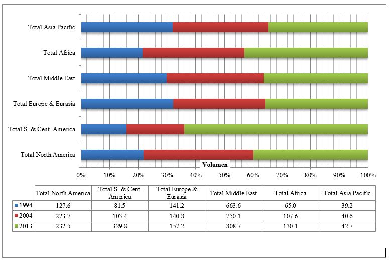 Medio Oriente, por ejemplo, posee casi dos tercios de las reservas mundiales de petróleo y un tercio de las reservas de gas natural. En concordancia con lo expuesto anteriormente, Mehmet Ozkam (2011) afirma que la razón principal por la cual existe un interés permanente del mundo occidental sobre la región es esencialmente el petróleo, dado que este es explotado en su mayoría por Países de Europa Occidental, Japón y EUA. Existen procesos de rivalidad militar entre superpotencias dependientes de crudo en esta región, considerada estratégica en torno al control territorial –como sucedió durante en el caso de las guerras mundiales- suscitando la configuración de una región compuesta por países cuyo ejercicio democrático es cuestionable, al respecto, el autor asegura: