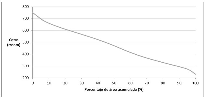 La curva hipsométrica permitió identificar el comportamiento del relieve y señalar una primera aproximación para definir las zonas funcionales. Los resultados mostrados en la figura 2, indican una microcuenca en su etapa de madurez, lo que significa que se encuentra en una etapa de equilibrio donde predominan los procesos de transporte de sedimentos y de agua, a la vez que no se descarta el efecto de la erosión hídrica en las zonas con mayor altitud. De igual forma, con base en el comportamiento del gradiente altitudinal y el área que acumula, se tiene una primera aproximación de la funcionalidad de la microcuenca, identificando que la zona funcional baja se localiza de los 210 a los 300 msnm, la zona media de los 300 a 480 msnm y la zona alta de los 480 a 752 msnm.